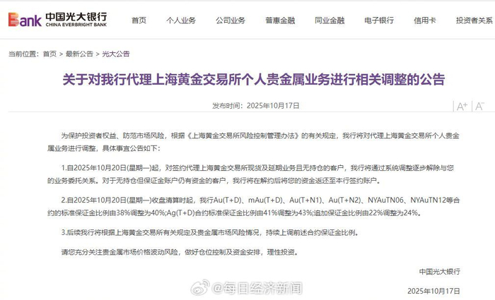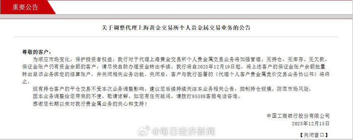 #多家银行关闭代理上金所个人贵金属业务#【工商银行发布重要公告:12月19日起调整!此前建设银行、邮储银行等已有动作】12月15日,工行发布公告称将加强代理上金所个人贵金属交易业务管理,无持仓等客户需尽快自助办理资金转出,2025年12月19日起将批量转出保证金余额并关闭功能。