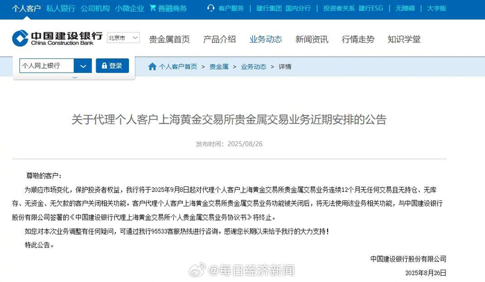 城商行中,宁波银行于9月30日发布公告表示,自10月13日起将停止受理代理个人客户上海黄金交易所现货实盘买入交易,卖出交易不受影响。(每经,希隆)