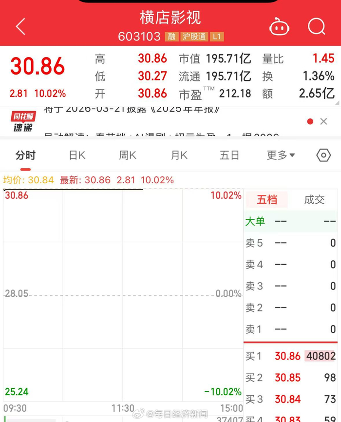 #横店影视四连板# 【横店影视连续4天涨停!三部影片定档春节档】2月3日,横店影视开盘后迅速涨停,报30.86元/股。截至2月3日,横店影视已经连续4个交易日涨停,近一个月的涨幅达86%。近日,横店影视的消息不少。截至目前,横店影视参与投资出品的《熊出没·年年有熊》《飞驰人生3》《星河入梦》已定档2026年春节档。特别是《熊出没·年年有熊》《飞驰人生3》的前作都取得了不错的票房。据1月31日公司公告的2025年年度业绩预告,公司预计2025年归母净利润1.3亿元至1.8亿元,同比扭亏为盈,主要受行业回暖、热门影片带动及精细化管理和降本增效措施影响。
