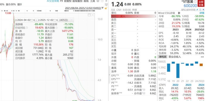 事实上,在收到证监会《决定书》的次日,*ST苏吴股票已开始停牌,停牌周期至12月8日结束。从停牌前的市场表现来看,截至11月25日收盘,该股票已连续五个交易日涨停,当天收报1.24元/股,涨幅达5.08%,总市值为8.81亿元。不过,与去年同时期相比,该公司的股价和市值,已缩水近九成。