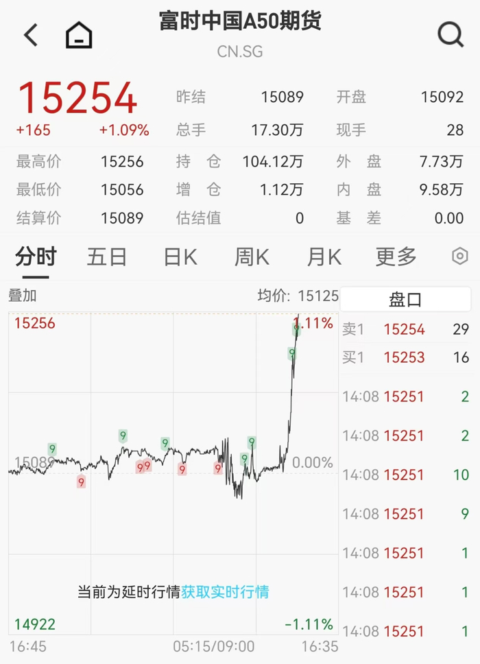 富时中国A50指数期货快速拉升,涨幅一度扩大至1.09%,随后有所收窄。