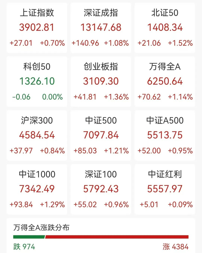 截至收盘,创业板指涨超1%,早盘一度跌超0.5%。沪深两市成交额1.73万亿,较上一个交易日放量1768亿,全市场近4400只个股上涨。