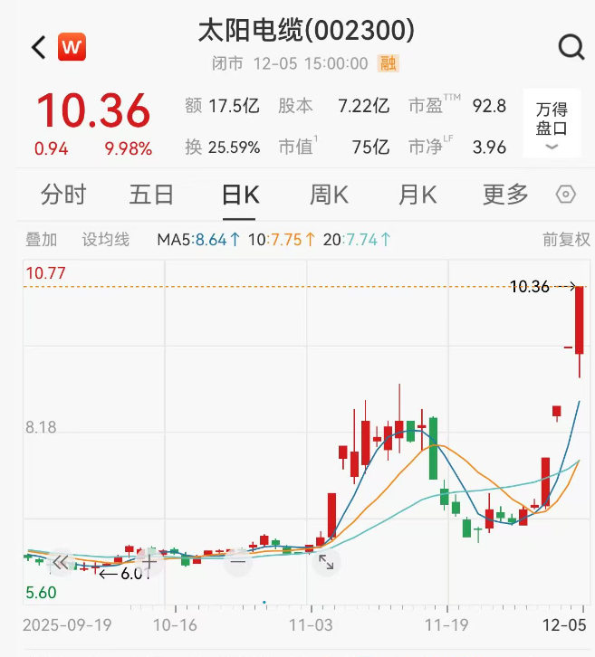 数据显示,福建板块、核电板块近期涨势明显,太阳电缆作为两个板块的热门成分股,12月2日—12月5日,收获“四连板”。截至12月5日收盘,太阳电缆涨停板上仍有超7万手封单,总市值为75亿元。今年以来,太阳电缆股价上涨超90%。