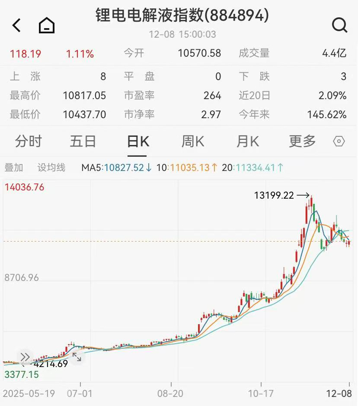 也正是从11月14日开始,电解液、碳酸亚乙烯酯(VC)等相关个股,陆续阶段性见顶回落。