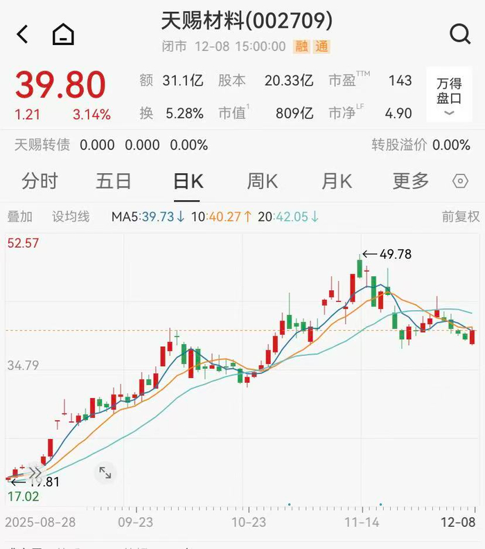 截至12月8日,天赐材料股价已经回落至39.8元/股附近,前期持续上调的六氟磷酸锂价格也已经暂时止步于18万元/吨,高位滞涨。