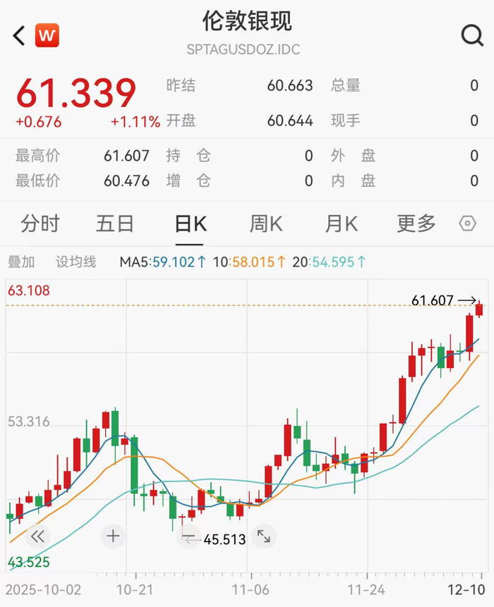 贵金属商品方面,现货白银午后继续发力,再度刷新历史新高,盘中最高触及61.607美元/盎司。现货白银今年以来涨幅已高达112%,而现货黄金的涨幅为60%,白银涨幅几乎是黄金的两倍。