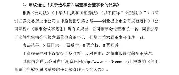 然而,在选举第六届董事会董事长的议案中却产生了变数,公司同意选举丁彦辉为公司第六届董事会。对此,丁彦辉投了1票反对,反对理由是对董事长岗位薪酬不满意。