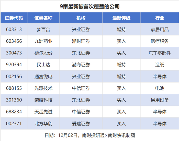 首次覆盖方面,12月2日券商共给出了9次首次覆盖,其中梦百合、通富微电获得兴业证券分别给予“增持”“增持”评级,九洲药业获得湘财证券给予“买入”评级,德尔股份获得东北证券给予“买入”评级,民士达获得渤海证券给予“增持”评级。