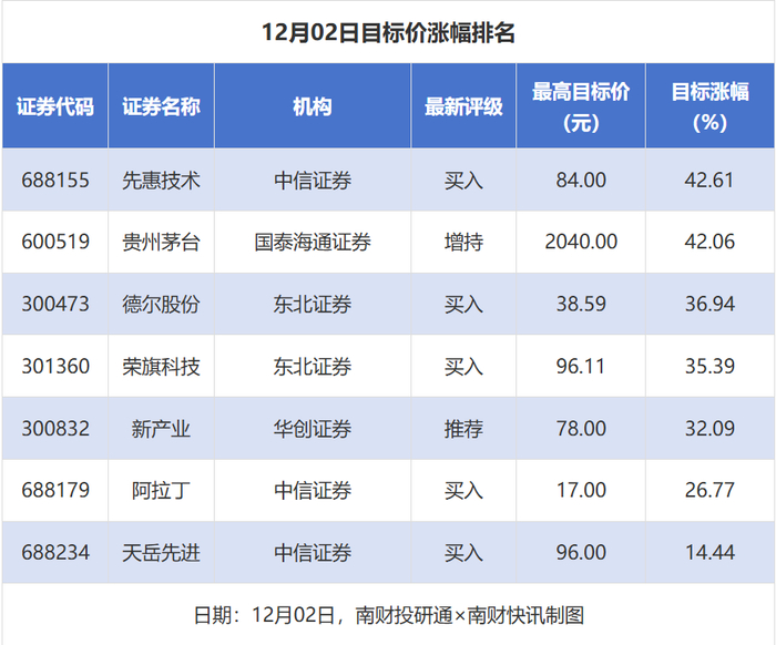 南财投研通数据显示,12月2日,券商给予上市公司目标价共7次,按最新收盘价计算,目标价涨幅排名居前的公司有先惠技术、贵州茅台、德尔股份,目标价涨幅分别为42.61%、42.06%、36.94%,分别属于电池、白酒、汽车零部件行业。