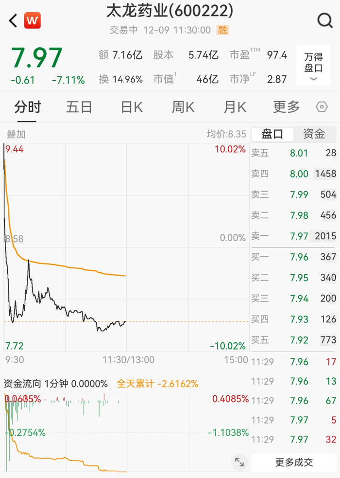 12月9日,太龙药业(600222.SH)复牌后涨停开盘,随后急速下杀翻绿,10分钟内跌超15%,维持低位震荡走势。截至午间收盘,报7.97元/股,跌7.11%。