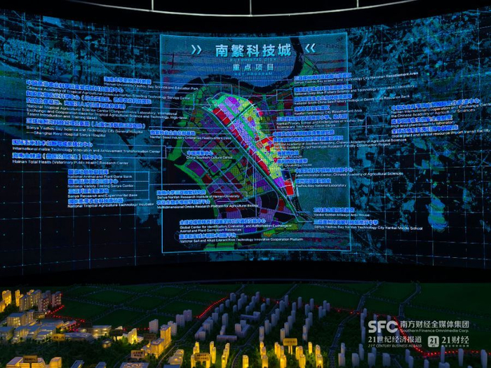 南繁科技城重点项目示意图。拍摄:张旭这一成果,是海南种业发展的一个缩影。在崖州湾科技城中的南繁科技城,越来越多的耐盐碱水稻新品种不断推出:“金丝优98香”在全生育期5‰盐水浓度下,亩产达327.2公斤;“箐两优3261”在全生育期3‰至5‰盐水浓度下,亩产超过400公斤……