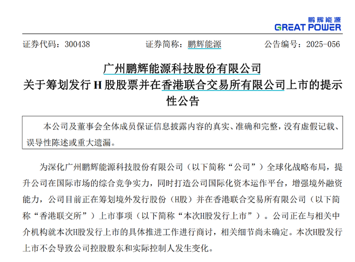 12月12日盘后,鹏辉能源(300438.SZ)公告,筹划发行H股并在香港联交所上市,以深化全球化战略布局,提升公司在国际市场的综合竞争实力,同时打造公司国际化资本运作平台,增强境外融资能力,