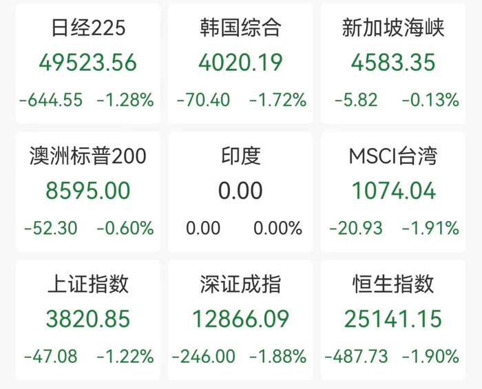 12月16日早盘,亚太主要股指全线下跌,截至午盘,日经225指数、韩国综合指数均跌超1%,A股三大指数与港股恒生指数集体飘绿,富时中国A50指数期货亦跌超1%。贵金属期货多数下挫,加密货币持续大跌。