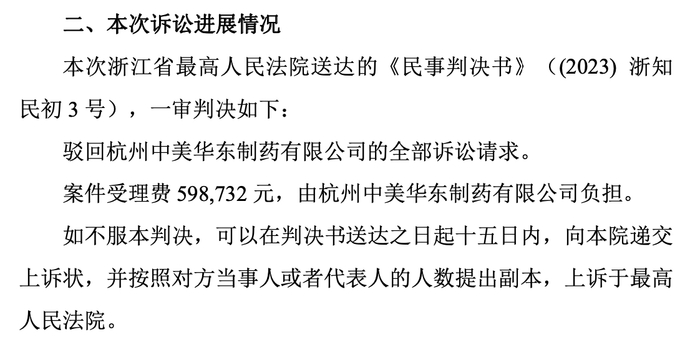 从最新进展看,浙江省高院的一审判决,驳回了中美华东的全部诉讼请求,并要求其负担59余万元的案件受理费。