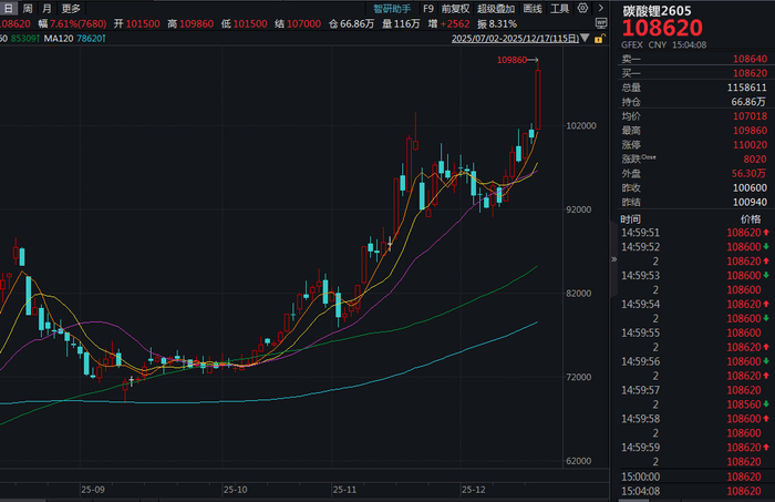 截至12月17日收盘,碳酸锂期货多个合约涨幅超过7%,其中主力合约LC2605等全面突破10万元/吨,远月合约LC2612更是站上11万元/吨。