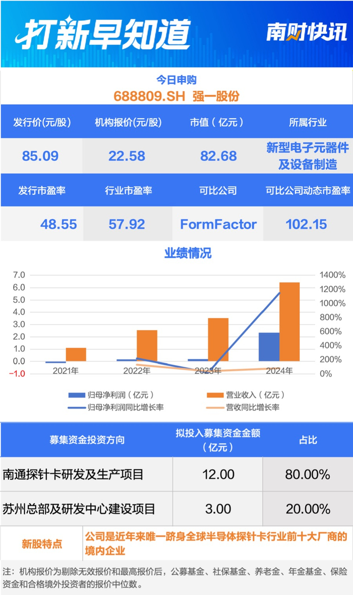 业绩方面,2022年至2024年,强一股份分别实现营业收入2.54亿元、3.54亿元、6.41亿元,分别实现净利润0.16亿元、0.19亿元、2.33亿元。2025年前三季度,强一股份实现营业收入6.47亿元,实现净利润2.5亿元。