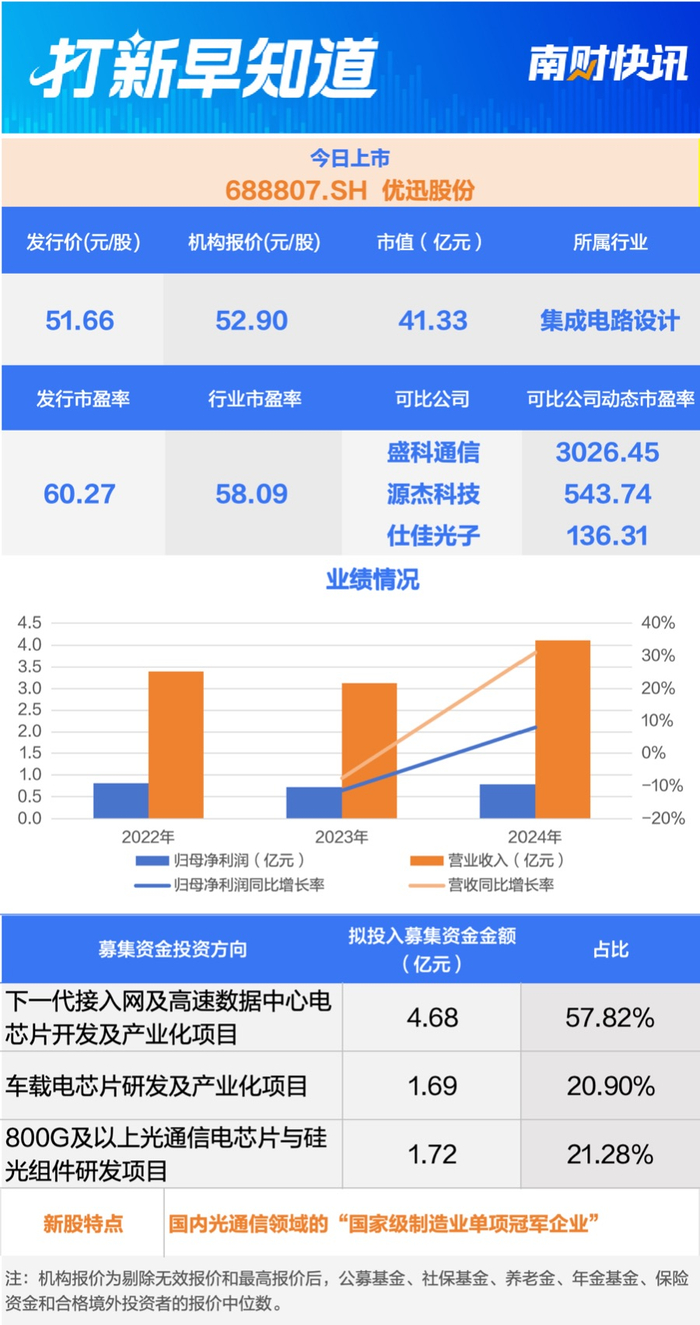 据招股书介绍,优迅股份为国内光通信领域的“国家级制造业单项冠军企业”,单项产品市场占有率位居全球前列。其核心产品“10G及以下光通信前端芯片组”率先实现低成本CMOS工艺集成,填补国内空白,显著压低相关芯片价格,降低下游光模块企业应用成本;目前已大批量进入国内主流模块厂、系统设备商与三大运营商,由此形成细分领域的领先地位。