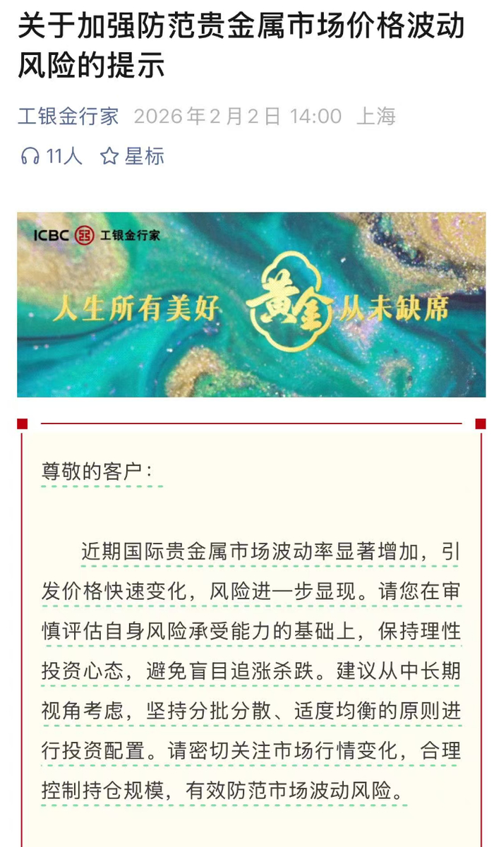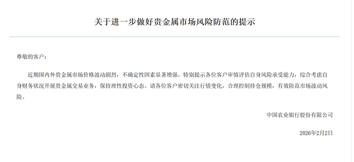 2月2日,工商银行、农业银行接连发布贵金属投资风险提示,针对近期国内外贵金属市场波动率显著增加、价格波动剧烈的市场现状,提醒投资者审慎评估风险承受能力,理性投资并做好风险防控。