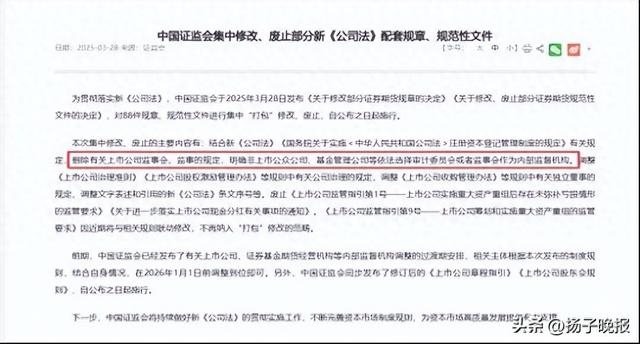 今年3月,证监会发布配套规定,要求上市公司应当在2026年1月1日前,按照有关规定,在公司章程中规定在董事会中设审计委员会,行使公司法规定的监事会职权,不设监事会或者监事。