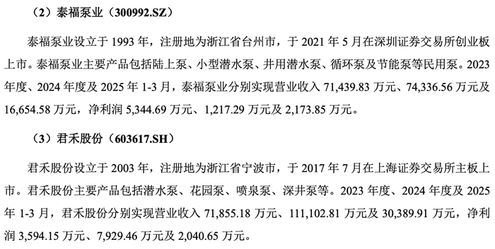 上述盈利能力已超过公转书列举的4家同行业中的两家上市公司。创业板上市公司泰福泵业同期的净利润分别为5344.69万元、1217.29万元和2173.85万元。上交所主板上市的君禾股份同期的净利润分别为3594.15万元、7929.46万元和2040.65万元。