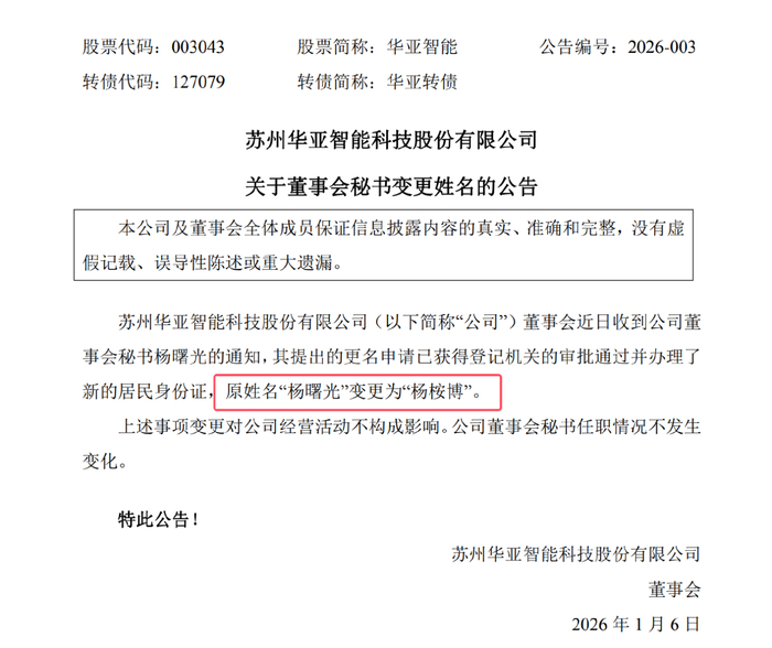 骚操作:苏州华亚智能 58 岁董秘杨曙光改名杨桉博发了一个公告!