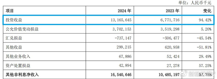 细看上海银行2024年的年报后会发现,该行营收增长的动力既不是来自传统的业务“利息净收入”,也不是非息收入中的“手续费及佣金净收入”,而是来自131.66亿元的“投资收益”,同比增长94.42%。