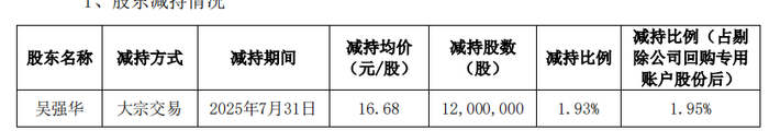 按减持均价16.68元/股计算,实际控制人吴强华本次套现2亿元。