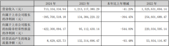 2024年,公司实现营业收入7.13亿元,同比减少41.20%;归属于上市公司股东的净利润-3.96亿元,同比减少394.45%;归属于上市公司股东的扣除非经常性损益的净利润-4.22亿元,同比减少544.00%;经营活动产生的现金流量净额862.94万元,同比减少93.48%。