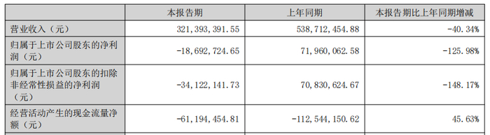 2025年上半年,公司实现营业收入为3.21亿元,同比下降40.34%;归属于上市公司股东的净利润-1869.27万元;归属于上市公司股东的扣除非经常性损益的净利润-3412.21万元;经营现金流净额为-6119.44万元。
