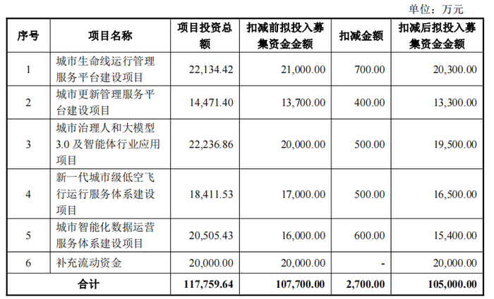 中国经济网北京10月16日讯 数字政通(300075.SZ)昨晚披露2025年度向特定对象发行A股股票预案称,本次向特定对象发行股票拟募集资金总额不超过105,000.00万元(含本数)。根据相关规则,截至预案公告日,公司前次募集资金中补充流动资金金额超出前次募集资金总额的30%,公司将超出部分于本次募集资金的总额中调减。调整前后具体投入情况如下:城市生命线运行管理服务平台建设项目、城市更新管理服务平台建设项目、城市治理人和大模型3.0及智能体行业应用项目、新一代城市级低空飞行运行服务体系建设项目、城市智能化数据运营服务体系建设项目、补充流动资金。