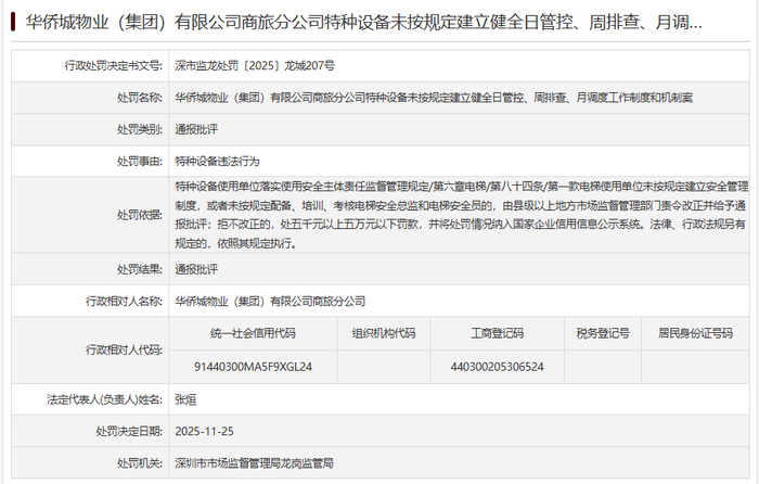 华侨城物业(集团)有限公司商旅分公司特种设备未按规定建立健全日管控、周排查、月调度工作制度和机制案显示,华侨城物业(集团)有限公司商旅分公司存在特种设备违法行为。根据《特种设备使用单位落实使用安全主体责任监督管理规定》第六章“电梯”第八十四条第一款的规定,深圳市市场监督管理局龙岗监管局对其处以通报批评。