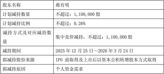 截至公告日,鹿有明持有公司股份4,994,930股,占公司总股本的1.17%。上述股份均为公司IPO前取得的股份(3,567,807股)及公司上市后以资本公积转增股本方式取得的股份(1,427,123股),截至公告披露日,鹿有明持有的公司股份4,994,930股均为无限售条件流通股。