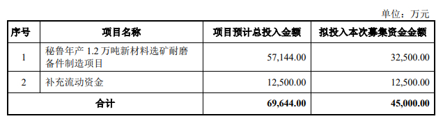 耐普矿机(300818.SZ)募集说明书显示,公司拟向不特定对象发行可转换公司债券募集资金总额不超过45,000.00万元(含),扣除发行费用后,募集资金拟用于秘鲁年产1.2万吨新材料选矿耐磨备件制造项目、补充流动资金。