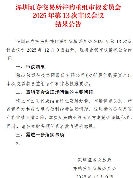 中国经济网北京12月10日讯 深交所并购重组审核委员会2025年第13次审议会议于昨日召开,会议审议结果显示,佛山佛塑科技集团股份有限公司(佛塑科技,000973.SZ)发行股份购买资产符合重组条件和信息披露要求。