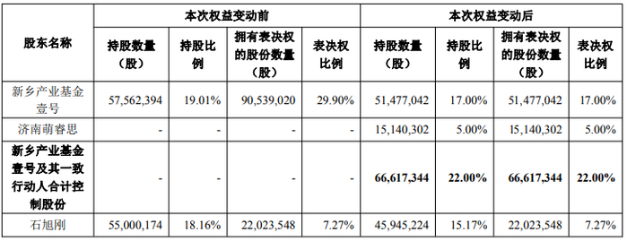 本次权益变动由收购方济南君川科技合伙企业(有限合伙)(以下简称“济南君川”)、济南君川执行事务合伙人北京九岱科技有限公司(以下简称“九岱科技”)分别受让上市公司控股股东新乡产业基金壹号55.00%有限合伙财产份额、0.0077%普通合伙财产份额,取得上市公司控股股东新乡产业基金壹号控制权;同时,九岱科技一致行动人济南萌睿思科技合伙企业(有限合伙)(以下简称“济南萌睿思”)协议受让石旭刚、新乡产业基金壹号合计持有的上市公司5.00%股份。其中,石旭刚转让上市公司9,054,950股股份,占上市公司总股本的2.99%,新乡产业基金壹号转让上市公司6,085,352股股份,占上市公司总股本的2.01%。此外,上市公司第二大股东石旭刚与新乡产业基金壹号协商一致并签署协议,解除双方此前约定的将部分表决权委托至新乡产业基金壹号的安排,由石旭刚承诺放弃其持有的上市公司23,921,676股股份(占上市公司总股本的7.90%)对应的表决权。