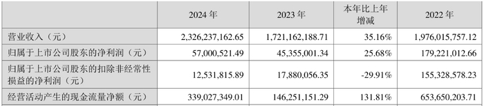 2024年,公司实现营业收入23.26亿元,同比增长35.16%;归属于上市公司股东的净利润5700.05万元,同比增长25.68%;归属于上市公司股东的扣非净利润1253.18万元,同比下降29.91%;经营活动产生的现金流量净额为3.39亿元,同比增长131.81%。