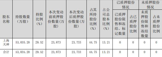 公司11月14日披露的关于控股股东部分股份解质押及质押展期的公告显示,公司近日接到控股股东上海天神通知,上海天神将其所持公司1.45%的股份办理了质押展期业务,质权人分别为中信证券、中金财富;将其所持公司0.08%的股份办理了解除质押业务,质权人为银河证券、东吴证券、国联民生。截至公告披露日,上海天神本次变动后质押股份数量23,733万股,占其所持股份比例44.75%,占公司总股本比例13.21%。