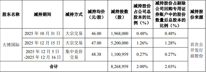 2025年10月31日至2025年12月16日,大博国际合计减持股数为8,268,959股。经计算,大博国际减持金额合计3.88亿元。