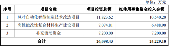 公司本次以简易程序向特定对象发行股票的募集资金总额不超过人民币24,229.10万元(含本数),扣除发行费用后的募集资金净额将全部用于以下项目:风叶自动化智能制造技术改造项目、高性能改性复合材料生产建设项目、补充流动资金。