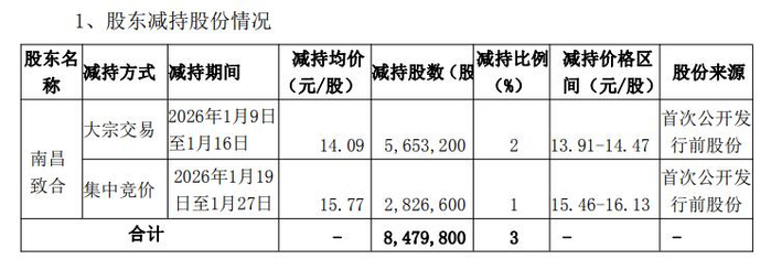 公司近日收到南昌致合出具的《关于股东股份减持计划实施完成的告知函》,获悉南昌致合于2026年1月9日至1月27日分别通过集中竞价方式减持公司股份2,826,600股,占总股本1%;通过大宗交易方式减持公司股份5,653,200股,占总股本的2%;合计减持股份8,479,800股,占公司总股本的3%,南昌致合持有公司股份比例从18.18%下降至15.18%。
