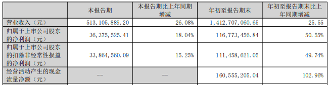 2025年前三季度,美力科技实现营业收入14.13亿元,同比增长25.55%;归属于上市公司股东的净利润1.17亿元,同比增长50.55%;归属于上市公司股东的扣除非经常性损益的净利润1.11亿元,同比增长49.74%;经营活动产生的现金流量净额1.61亿元,同比增长102.96%。