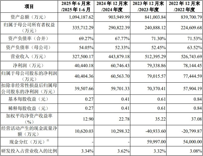 2022年、2023年、2024年和2025年1-6月,振石股份实现营业收入526,743.69万元、512,395.29万元、443,879.18万元和327,500.17万元,实现净利润分别为78,144.45万元、79,338.86万元、60,746.43万元和40,440.18万元,实现归属于母公司股东的净利润分别为77,444.59万元、79,015.57万元、60,563.70万元和40,404.36万元,实现扣除非经常性损益后归属母公司股东的净利润分别为57,904.19万元、70,370.41万元、59,701.33万元和39,507.66万元。