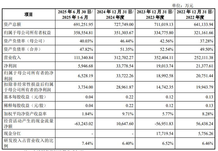 2022年、2023年、2024年、2025年1-6月,电科蓝天实现营业收入分别为252,111.38万元、352,404.11万元、312,702.27万元、111,340.84万元;净利润分别为21,377.61万元、19,013.74万元、33,778.54万元、5,946.68万元;归属于母公司所有者的净利润分别为20,751.44万元、18,992.58万元、33,722.26万元、6,528.19万元;扣除非经常性损益后归属于母公司所有者的净利润分别为19,943.79万元、14,742.35万元、28,961.87万元、3,734.00万元。