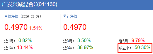 而根据截至2026年2月9日的最新数据显示,成立于2021年1月6日的广发兴诚混合C/A的累计收益率表现最差,分别为-50.30%、-49.28%。