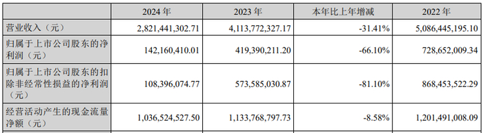 2024年,沃森生物营业收入为282,144.13万元,同比下降31.41%;归属于上市公司股东的净利润为14,216.04万元,同比下降66.10%;归属于上市公司股东的扣除非经常性损益的净利润10,839.61万元,同比下降81.10%;经营活动产生的现金流量净额103,652.45万元,同比下降8.58%。