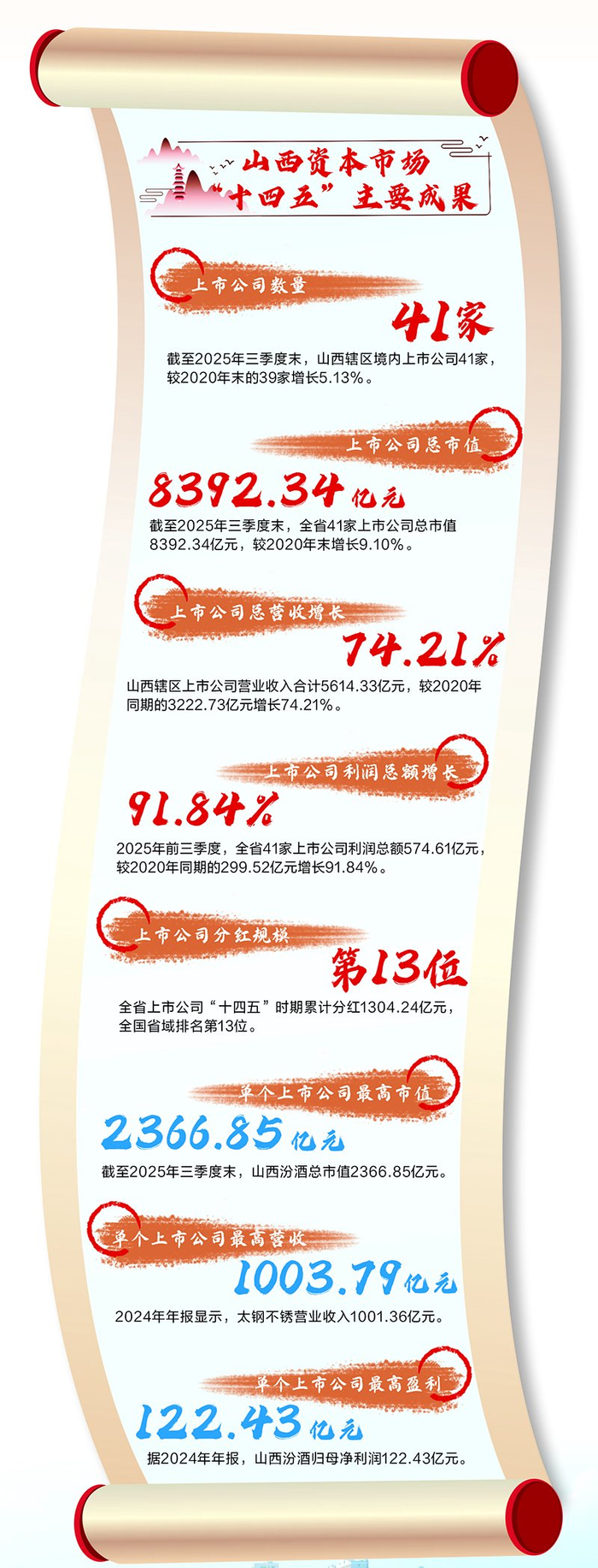 “境内上市公司总量达到41家,总市值提升至8392.34亿元,利润总额期间提升幅度达91.84%。”回顾“十四五”时期资本市场对企业的助力成果,山西证监局相关负责人在接受证券时报记者采访时提及,借助股权融资、债券发行等工具,山西辖区上市公司实现了资本结构优化与战略转型加速的双重突破,战略性新兴产业上市公司占比提升,形成“龙头企业引领、创新企业跟进”的多层次格局。