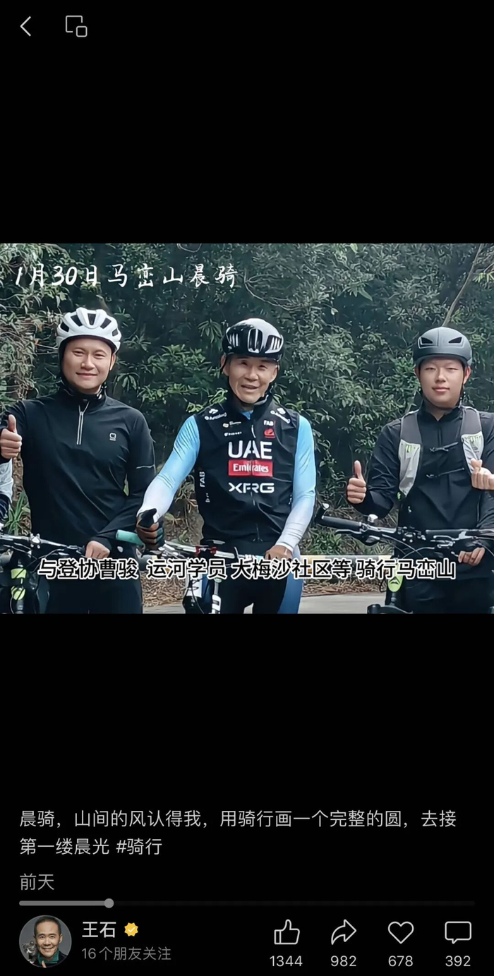 同日,王石朋友圈转发视频,并发文称:“现实与魔幻(02)01月30日晨,深石集团总办团建——公路/山地自行车20公里⋯⋯手机在自行车赛装的后背袋,行进中,手机像失控的震颤,没有理睬⋯⋯结束行程,一身臭汗,岂一个‘爽’了得!打开手机,喔,这么多哥们儿短信!简单的问询:你在哪?!明白了,被老友记惦记着,谢!”