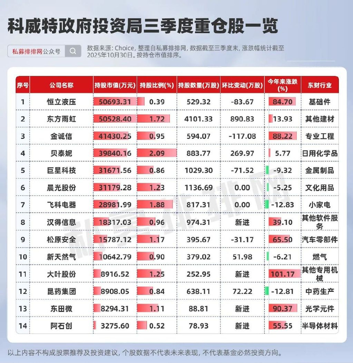 此外,科威特政府投资局三季度位列A股14家上市公司的前十大流通股东名单,合计持有市值约为34.85亿元。值得关注的是,科威特政府投资局与阿布达比投资局第一大重仓股不谋而合,均为恒立液压:科威特政府投资局最新持股数量为529.32万股,持有市值高达5.07亿元。