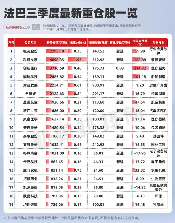 截至三季度末,法巴共重仓持有19家A股公司,持有市值合计为3.75亿元,最大重仓股是税友股份,三季度持有公司143.52万股,持有市值约为7295.10万元。