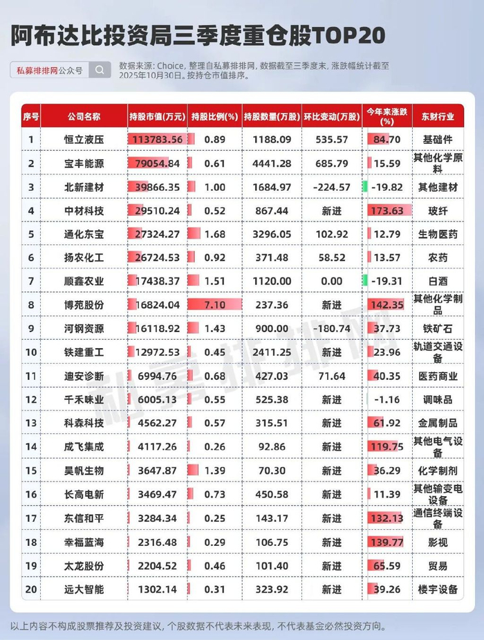 前三大重仓股分别是:恒立液压、宝丰能源、北新建材,持有市值约为11.38亿元、7.91亿元、3.99亿元。其中恒立液压与宝丰能源,阿布达比投资局在三季度加仓动作明显,分别加仓535.57万股、685.79万股。